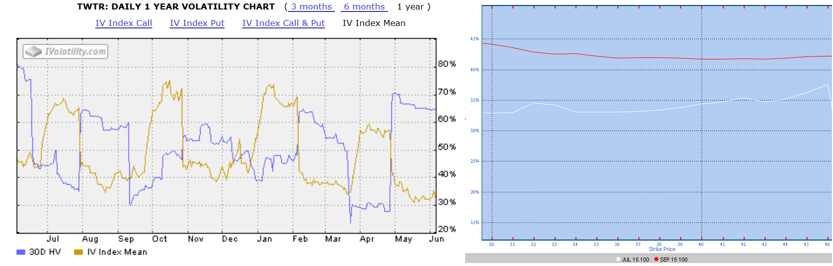 La primera es su situación actual de volatilidad, es baja. En este post traté el tema del análisis de la volatilidad tanto histórica como implícita, visualizando el gráfico inferior izquierdo puedo afirmar que está baja con respecto a los niveles donde ha estado en el último año. No quiere decir que sea barata y que planteando estrategias de compra de volatilidad fueran ganadoras seguras, sirve para mostrarnos lo que lo operadores piensan del futuro movimiento de la acción, es una foto fija a fecha de hoy, si luego se mueve menos de lo que descuentan habremos comprado caro. Dicho esto, lo que si es cierto es que una straddle de Julio 15 (3,35$) cuesta un 29% menos que la similar en términos de volatilidad implícita de hace un año de Julio 14 (4,70$).