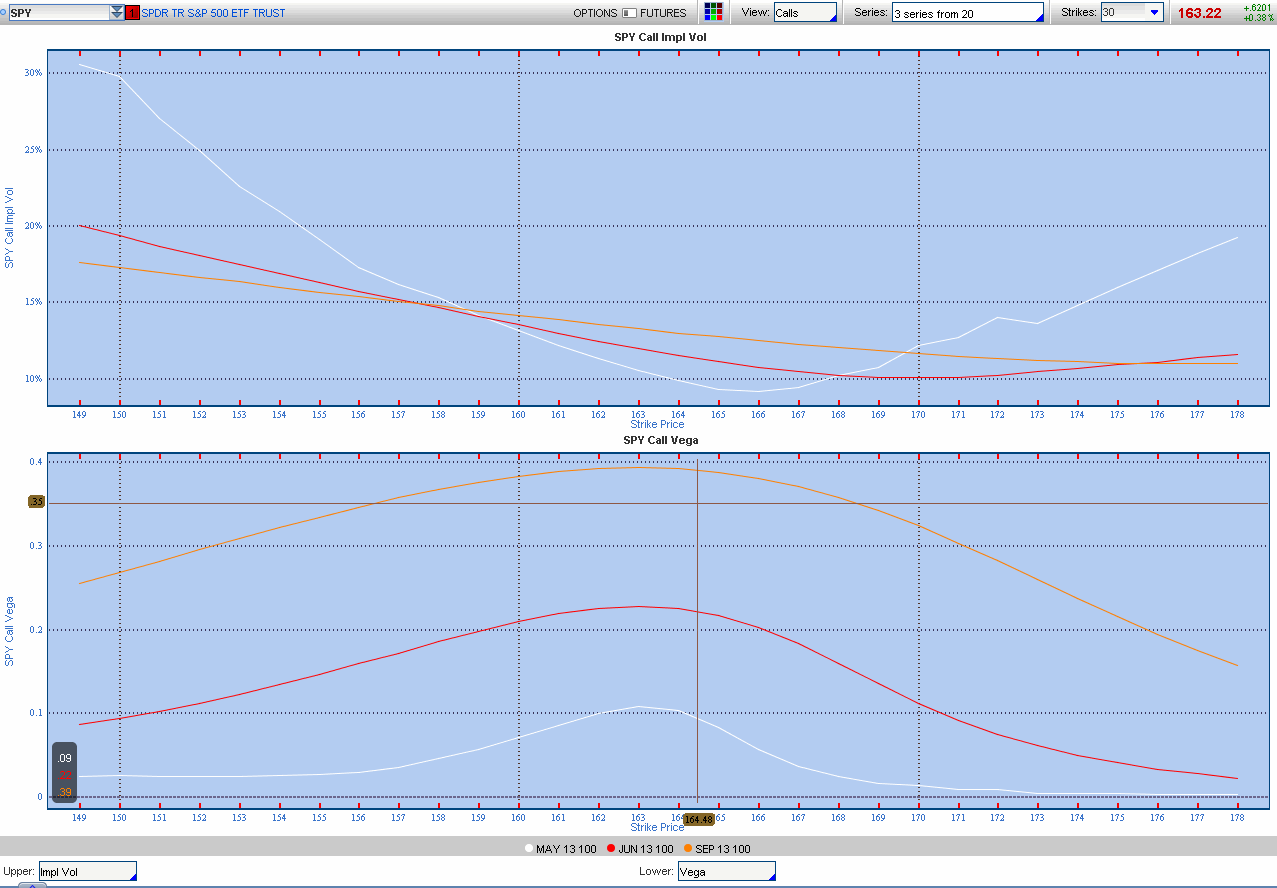 La gráfica de la imagen superior, y como ejemplo, se lee de la siguiente manera: en la parte inferior y para la expiración de mayo 13 (línea blanca) y para el strike de 162 la vega es 0.1 (11$ de variación de prima por cada 1% que varie la IV); en la parte superior de la gráfica vemos que para el strike de 165 la IV es de 8% para mayo,11% para junio y 13% para septiembre.