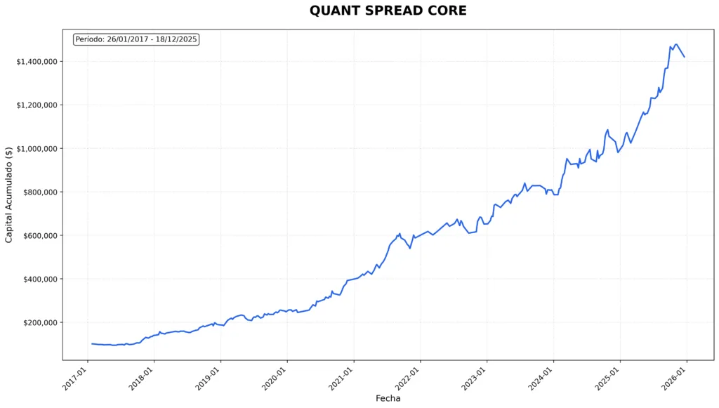 La imagen que ves a continuación representa la evolución de capital del sistema base de Quant Spread Core, operado con reglas claras, riesgo definido y sin intervención discrecional.
